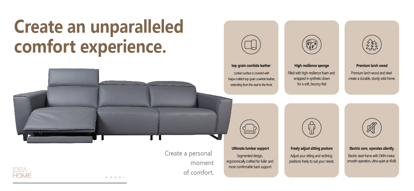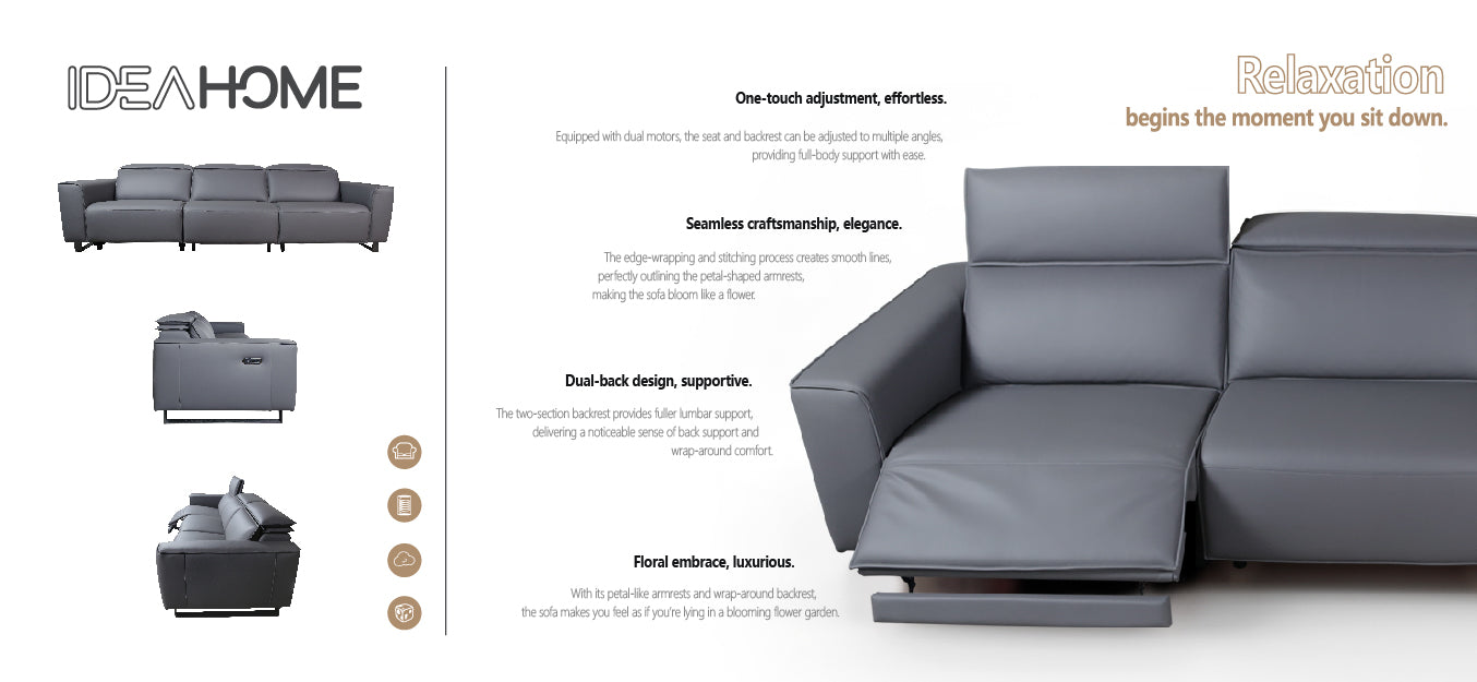 Relaxation redefined. Sink into luxury with our recliner sofa, featuring one-touch adjustment, dual motors, and ultimate lumbar support. Crafted with premium materials and a sleek design, it’s the perfect blend of comfort and style.